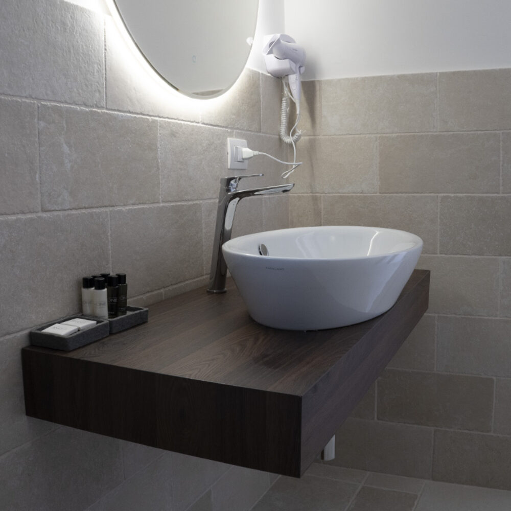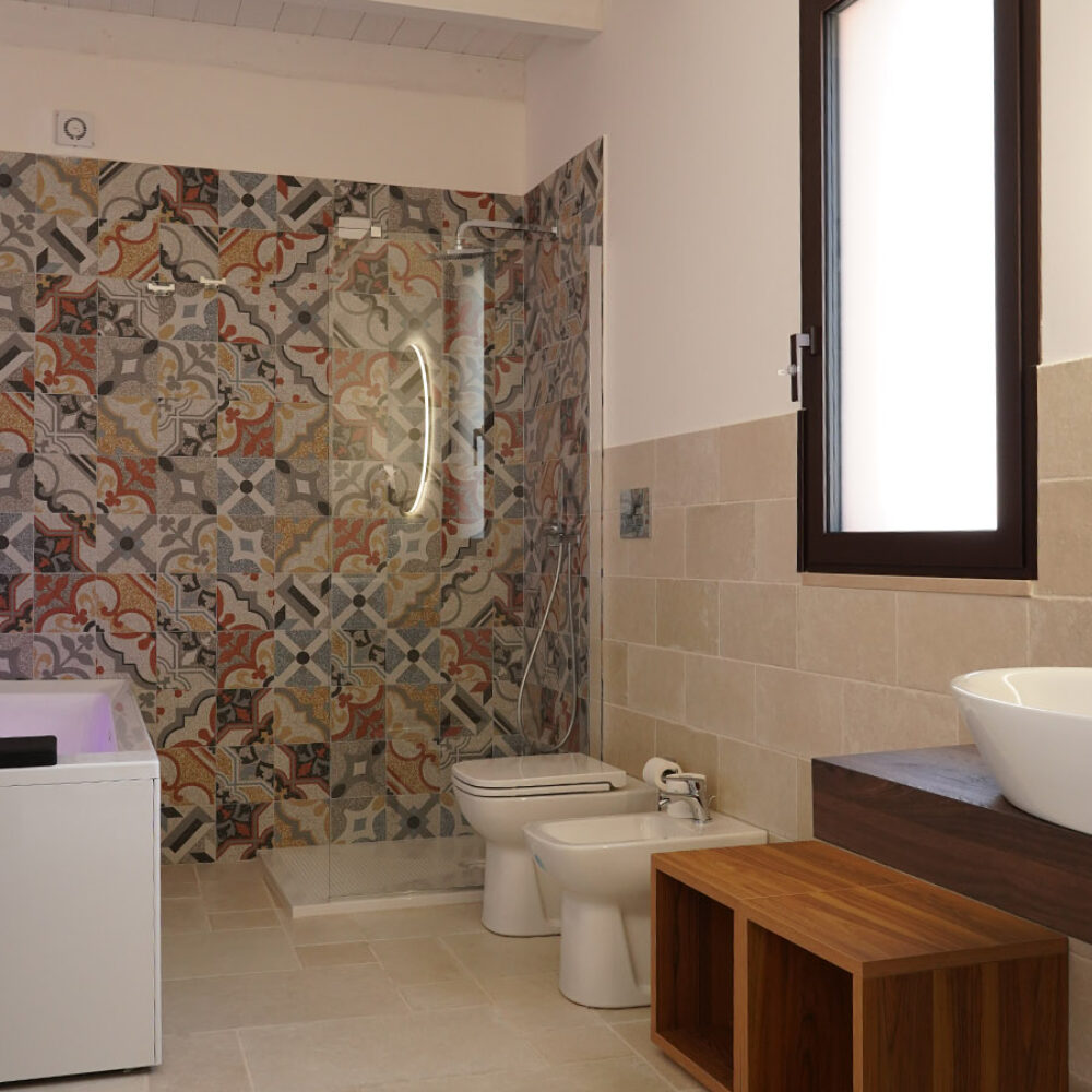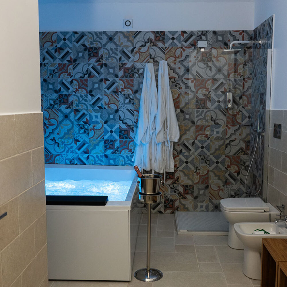 La classica sala da bagno oltre ad essere dotata di tutti i comfort standard possiede una superba vasca idromassaggio doppia per consentire agli ospiti di rilassarsi in intimità dopo una giornata intensa di turismo o di lavoro.